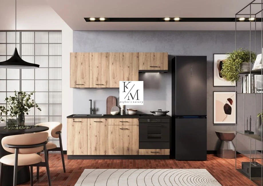 Front i korpus z płyty laminowanej o grubości 16 mm. Cokół w zestawie z szafką, podstawowe akcesoria montażowe w komplecie, blat do wyboru w opcjach dodatkowych.