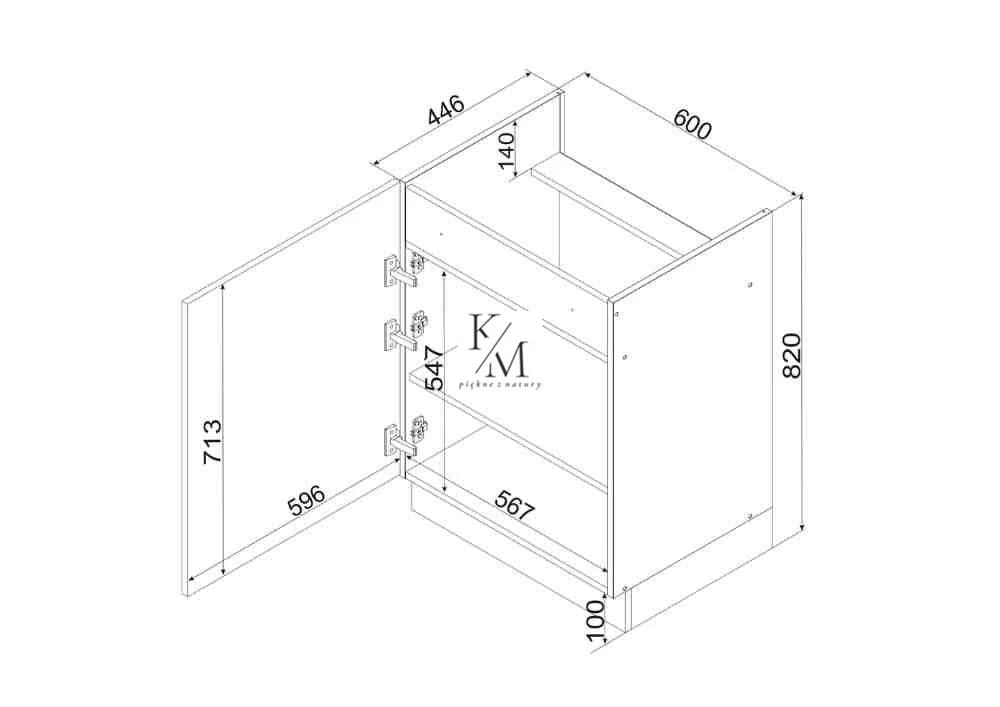 Front i korpus z płyty laminowanej o grubości 16 mm. Cokół w zestawie z szafką, podstawowe akcesoria montażowe w komplecie, blat do wyboru w opcjach dodatkowych.