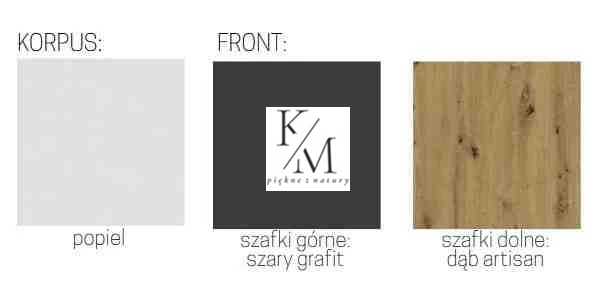 Front i korpus z płyty laminowanej o grubości 16 mm. Cokół w zestawie z szafką, podstawowe akcesoria montażowe w komplecie, blat do wyboru w opcjach dodatkowych.