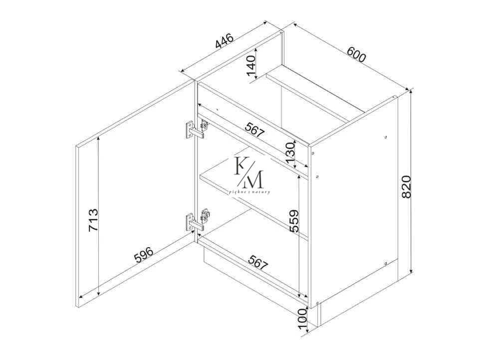 Front i korpus z płyty laminowanej o grubości 16 mm. Cokół w zestawie z szafką, podstawowe akcesoria montażowe w komplecie. Szafki dolne bez blatu. Blat dedykowany kolekcji to blat czarna skała lub petra beż. Ponadto istnieje możliwość zakupu innych blatów z dostępnej oferty.