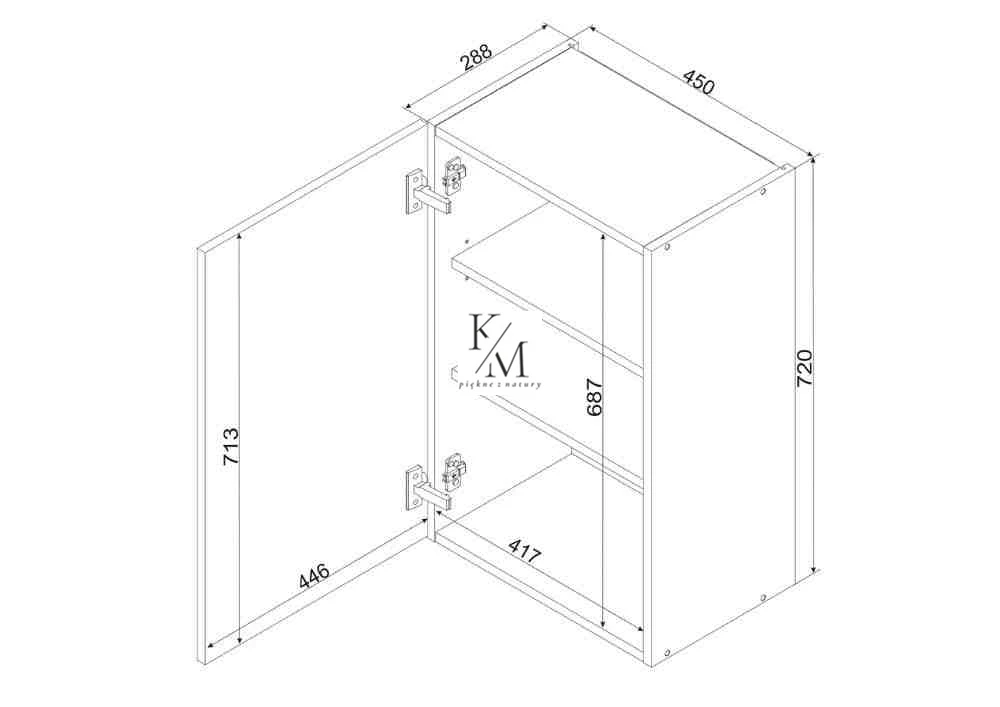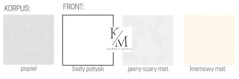 Front wykonany z płyty MDF foliowanej o grubości 16 mm, natomiast korpus z płyty laminowanej o grubości 16 mm. Cokół w zestawie z szafką, możliwość regulacji wysokości półek, podstawowe akcesoria montażowe w komplecie.