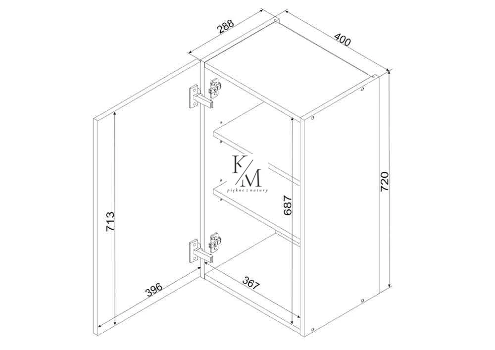 Front i korpus z płyty laminowanej o grubości 16 mm. Możliwość regulacji wysokości półek, podstawowe akcesoria montażowe w komplecie.
