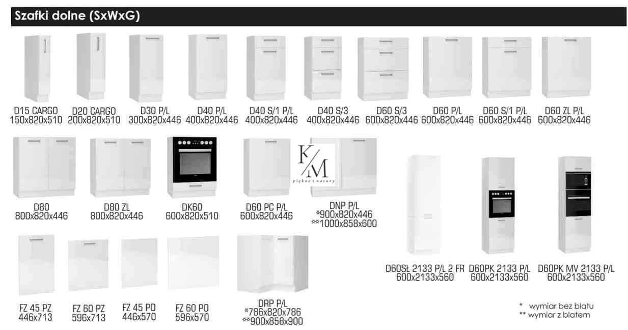 Front wykonany z płyty połysk o grubości 16mm, natomiast korpus z płyty laminowanej o tej samej grubości. Cokół w zestawie z szafką, możliwość regulacji wysokości półek, podstawowe akcesoria montażowe w komplecie, blat do wyboru w opcjach dodatkowych.
